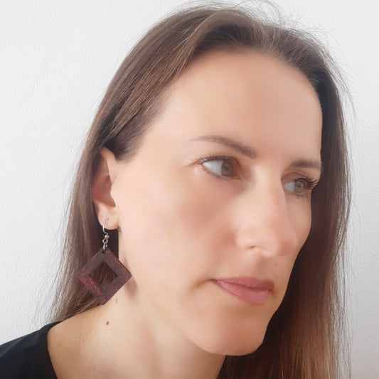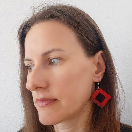 Crvene kvadratne unikatne drvene naušnice