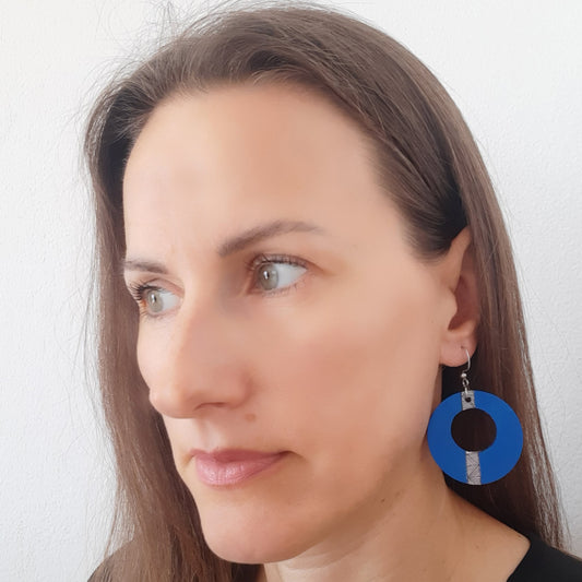 Plave unikatne ručno crtane drvene naušnice u obliku kruga