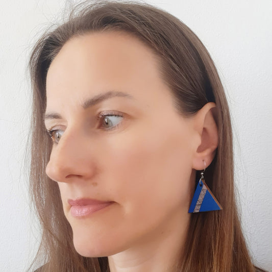 Unikatne plave drvene naušnice u obliku trokuta