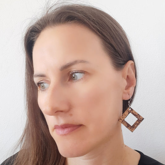 Smeđe unikatne drvene naušnice sa bakrenim detaljima