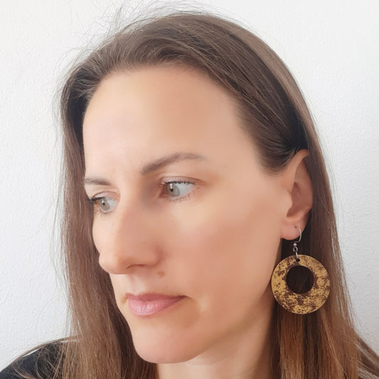 Smeđe okrugle unikatne drvene naušnice sa zlatnim detaljima