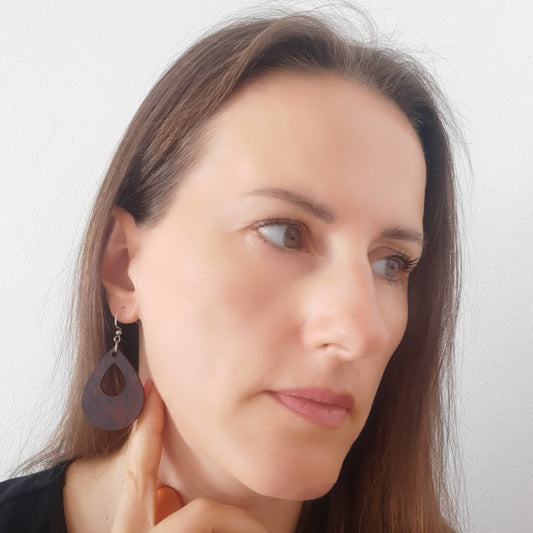 Crno crvene unikatne drvene naušnice u obliku suze