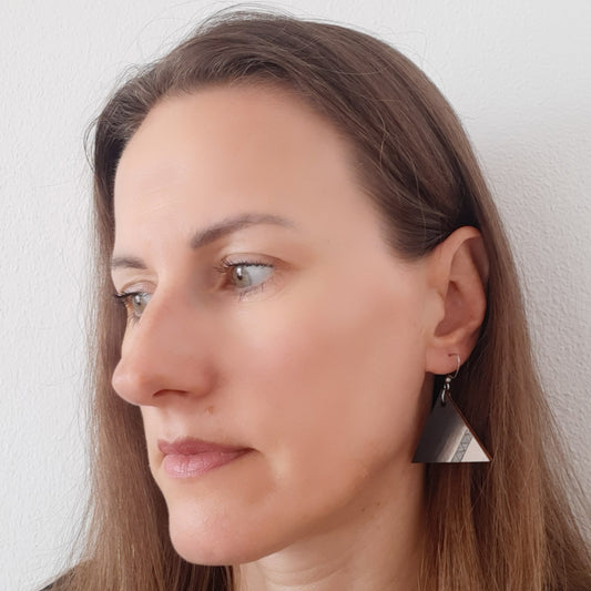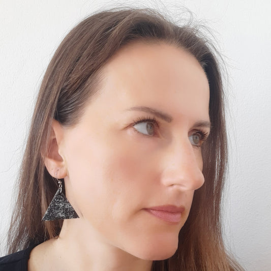 Crne drvene naušnice u obliku trokuta sa srebrnim detaljima