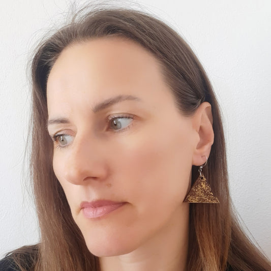 Unikatne smeđe drvene trokutaste naušnice sa zlatnim detaljima