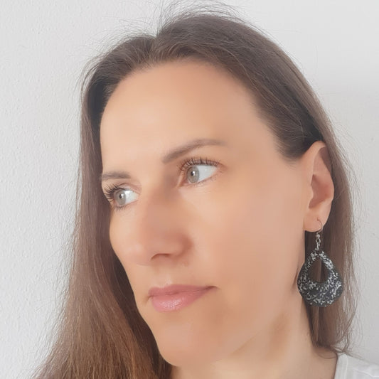 Velike naušnice od laganog drva. Svaka naušnica je unikatna, ručno oslikana akrilnim bojama i obostrano iscrtana tušem te zaštićena lakom. Udice su izrađene od medicinskog čelika, što znači da su antialergijske (bez nikla i olova) sa silikonskim čepovima.