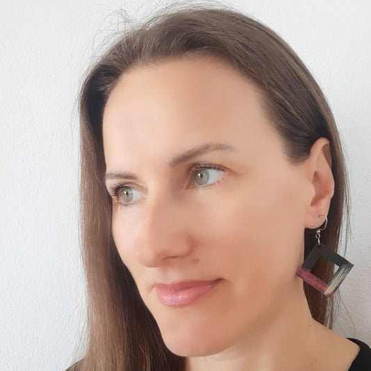 Unikatne crne drvene naušnice sa ružičastim i žutim detaljima
