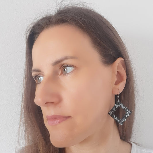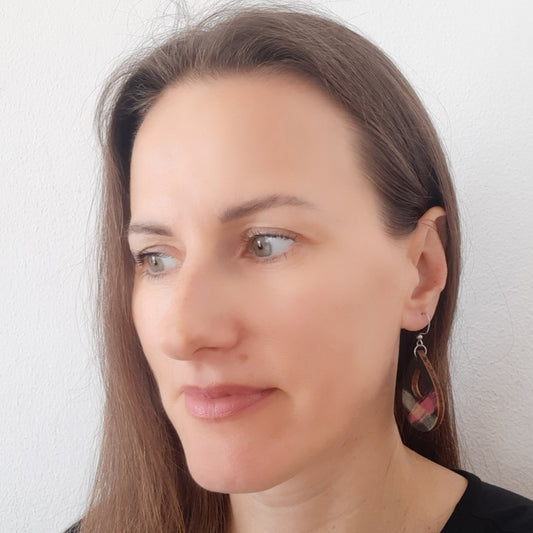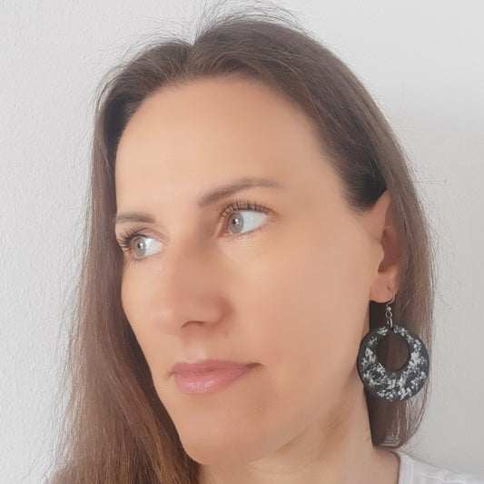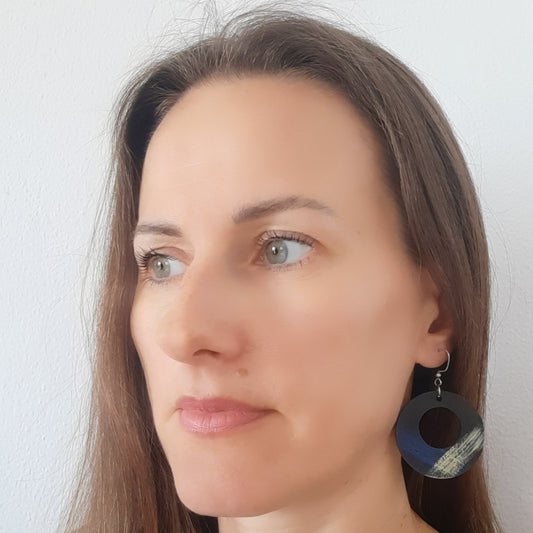 Velike naušnice od laganog drva. Svaka naušnica je unikatna, ručno oslikana akrilnim bojama i obostrano iscrtana tušem te zaštićena lakom. Udice su izrađene od medicinskog čelika, što znači da su antialergijske (bez nikla i olova) sa silikonskim čepovima.