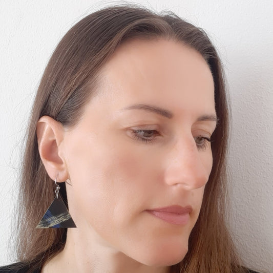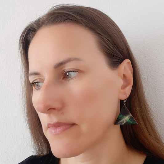 Crne drvene naušnice u obliku trokuta sa zelenim i žutim detaljima