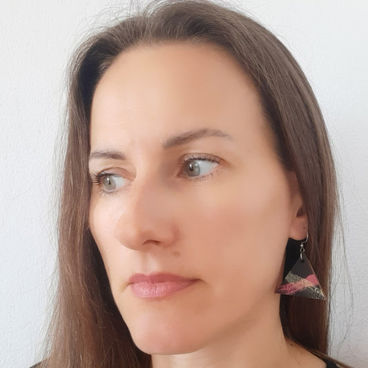 Crne trokutaste drvene naušnice s ružičasto žutim detaljima