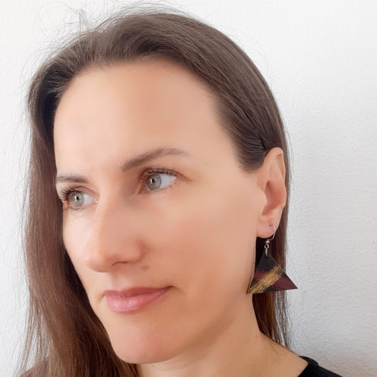 Unikatne crne drvene trokutaste naušnice sa crvenim i zlatnim detaljima