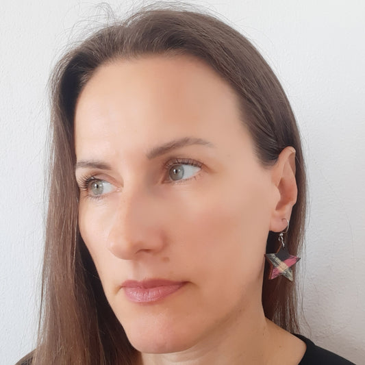 Crne unikatne drvene naušnice u obliku zvijezde s ružičasto žutim detaljima