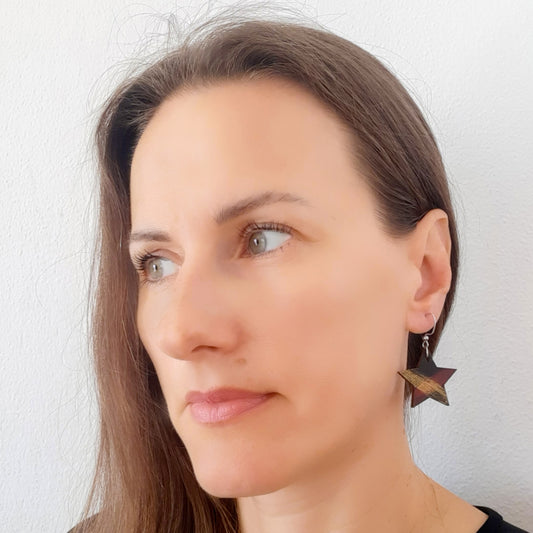 Crne unikatne drvene naušnice u obliku zvijezde s crveno zlatnim detaljima