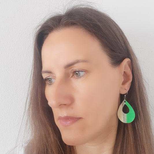 Lagane crne drvene naušnice sa zelenim i žutim detaljima