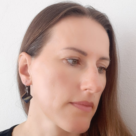 Unikatne male pravokutne crne naušnice sa zelenim i žutim detaljima