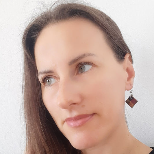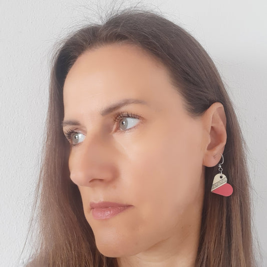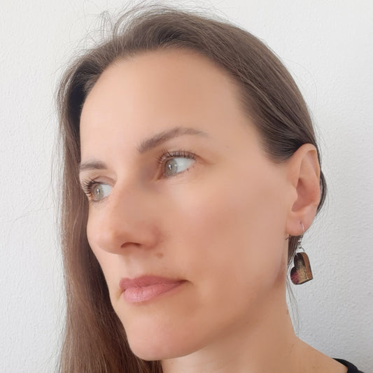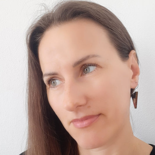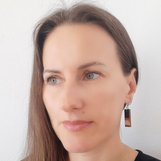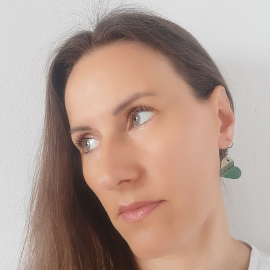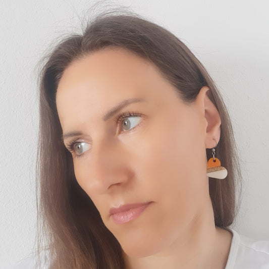 Male naušnice od laganog drva. Svaka naušnica je unikatna, ručno oslikana akrilom i obostrano iscrtana tušem te zaštićena lakom. Udice su izrađene od medicinskog čelika, što znači da su antialergijske (bez nikla i olova) sa silikonskim čepovima.